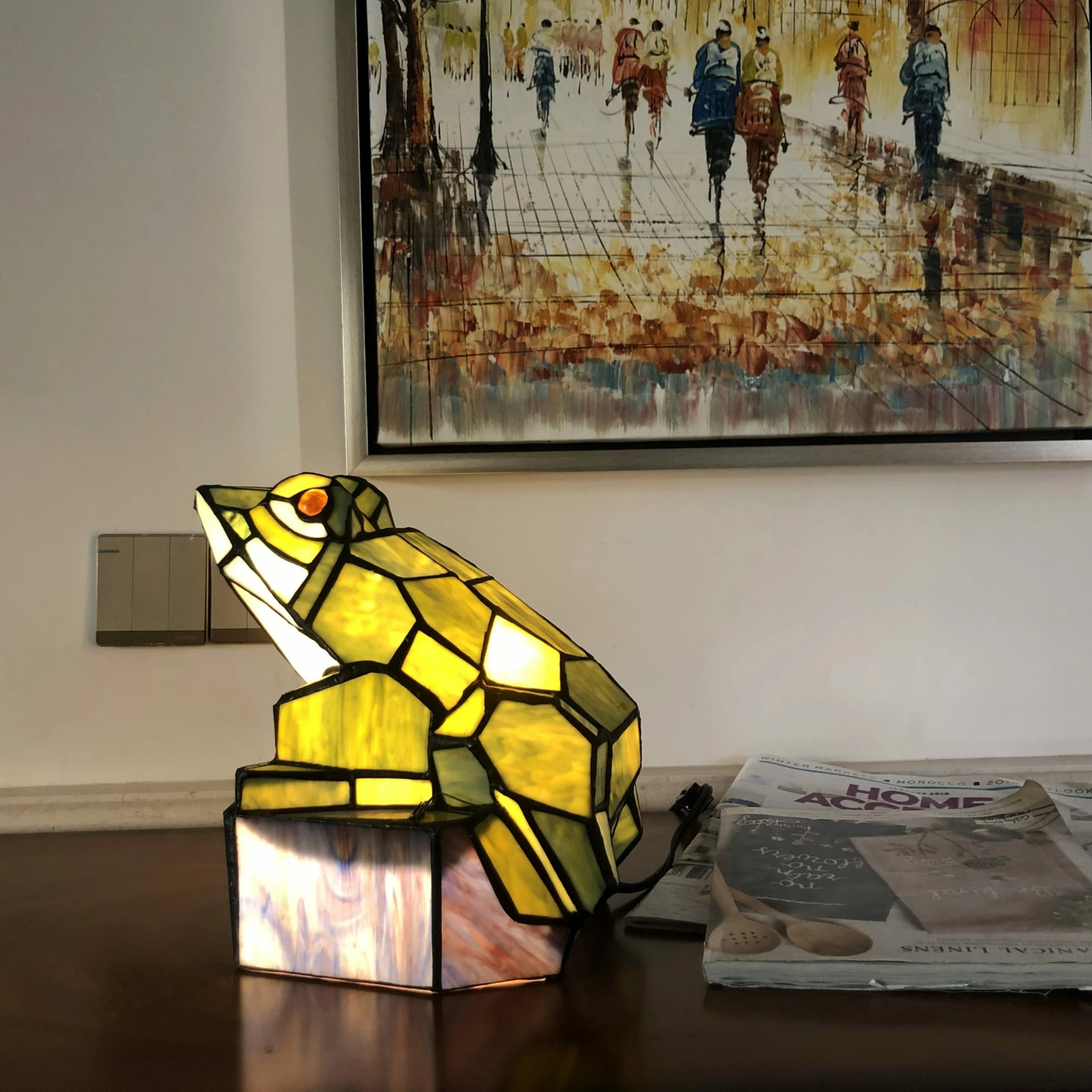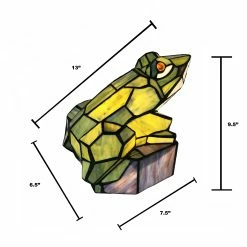 Do you like frogs? Then this adorable froggy light is the one for you. This playful, Tiffany-style frog shade one-light accent lamp and/or night light features a dark bronze finish. Hand crafted from 132 individually hand cut pieces of art glass and 2 glass beads that will add color and beauty to any room.