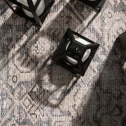 This distinctively understated yet eye-catching ombre area rug boasts an elegantly antiqued trellis and border pattern, complete with tranquil, soothing tones of peach, blue, and tan. Printed on weather-resistant polyester, and topped off with a flat, durable finish, this area rug is simply begging to embellish your bare floors for visible glamour and comfort underfoot.