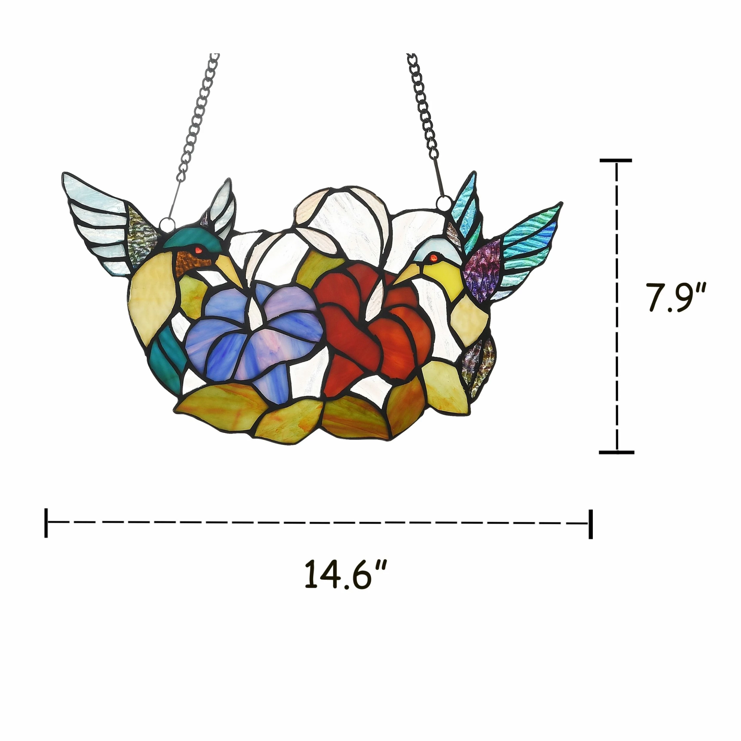 Displaying a range of rich hues and a pair of cute little birds sipping their flowers’ nectar, this window panel will add color and beauty to any room. Crafted from 72 hand-cut pieces of art glass and two glass beads, this piece offers shades of orange, green, and purple, for a decidedly distinctive accent to a colorless space.