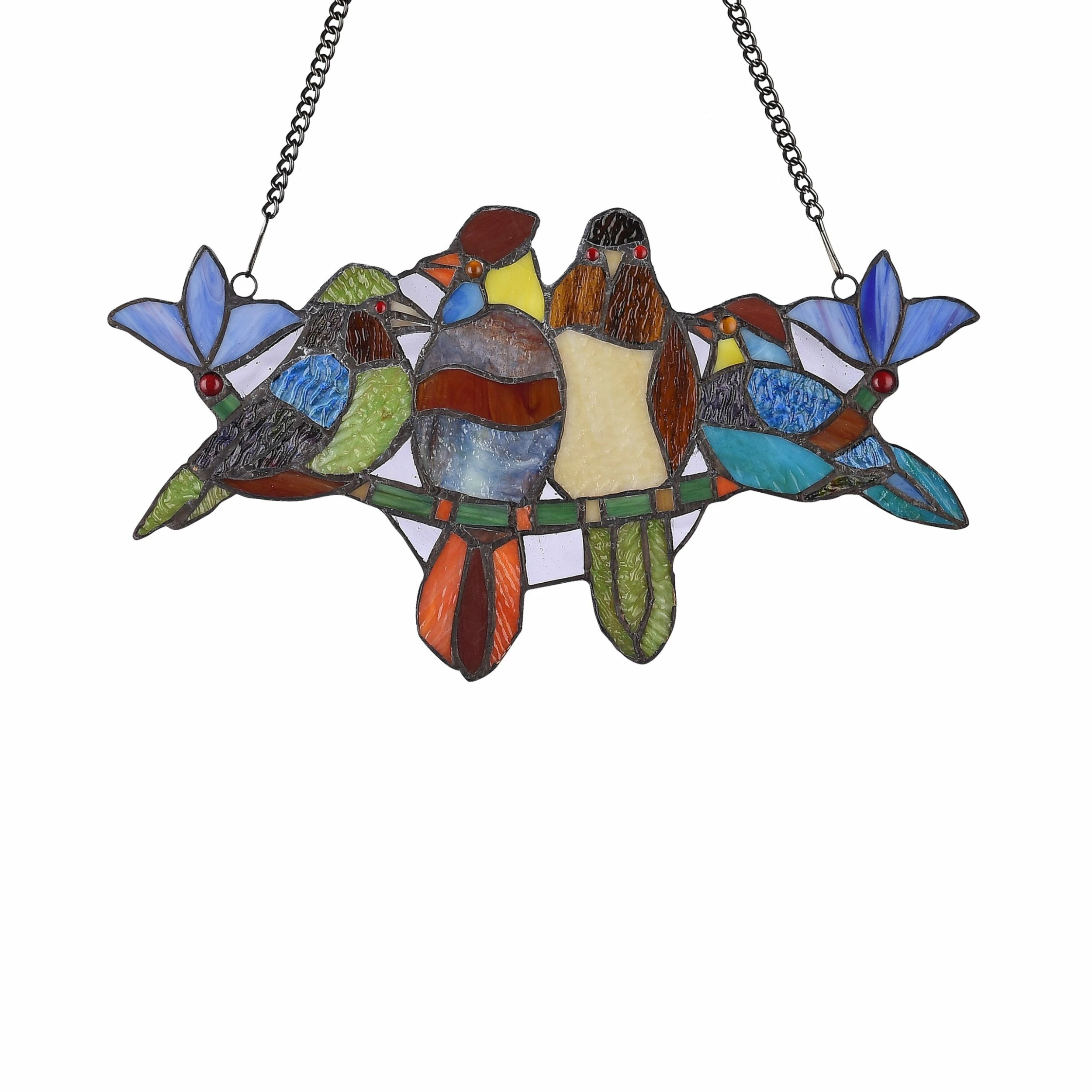 Showing off a handsome color palette worthy of royalty, this avian window panel brings colorful joy to nearly any space. Crafted from 78 hand-cut pieces of art glass and seven glass beads, this window panel delivers shades of brown, green, and blue to a room in dire need of a pop of sumptuous, charming color.