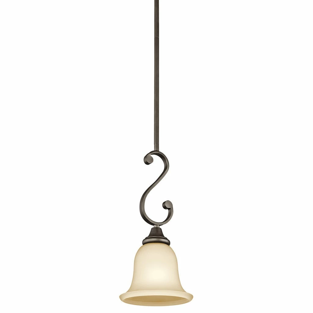 This Feraoun collection 1-light LED mini pendant features an olde bronze finish that will complement many traditional decors. The curved design of the steel frame adds interest while the light umber etched glass shade softens the light creating a warm ambiance. This pendant from the Feraoun(TM) lighting collection is a unique twist on traditional Americana. The distinctive metal base is touched with an olde bronze finish, which beautifully complements the light umber etched glass adornment. With this design, we have turned tradition on its head to create an updated look. The 3000 Kelvin Temp is equivalent to a 40 W incandescent bulb. This piece includes 36 inches of stems and 60 inches of wire so it can be hung at your desired height (up to 54 inches). Dimensions: 16 inches high x 7 inch diameter. Turn on our fixtures, and watch your room transform even more.