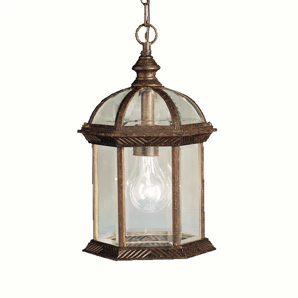 Hang this Hannah outdoor pendant from Gracewood Hollow on your front porch next to your door or on the back porch near an outdoor dining set. The hexagonal lantern features clear beveled glass, an aluminum frame, a tannery bronze finish, and a domed top.