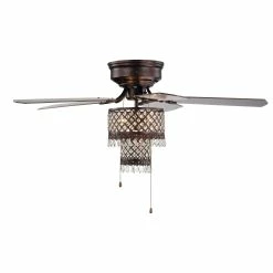 The ideal answer to your cooling and lighting needs, this ceiling fan showcases a sultry, rustic bronze finish, crystal-encrusted chandelier-inspired metal shade that glimmers and shines when lit up. The five-blade fan provides great air flow with a three-speed reversible motor that insures you find just the right comfort level.
