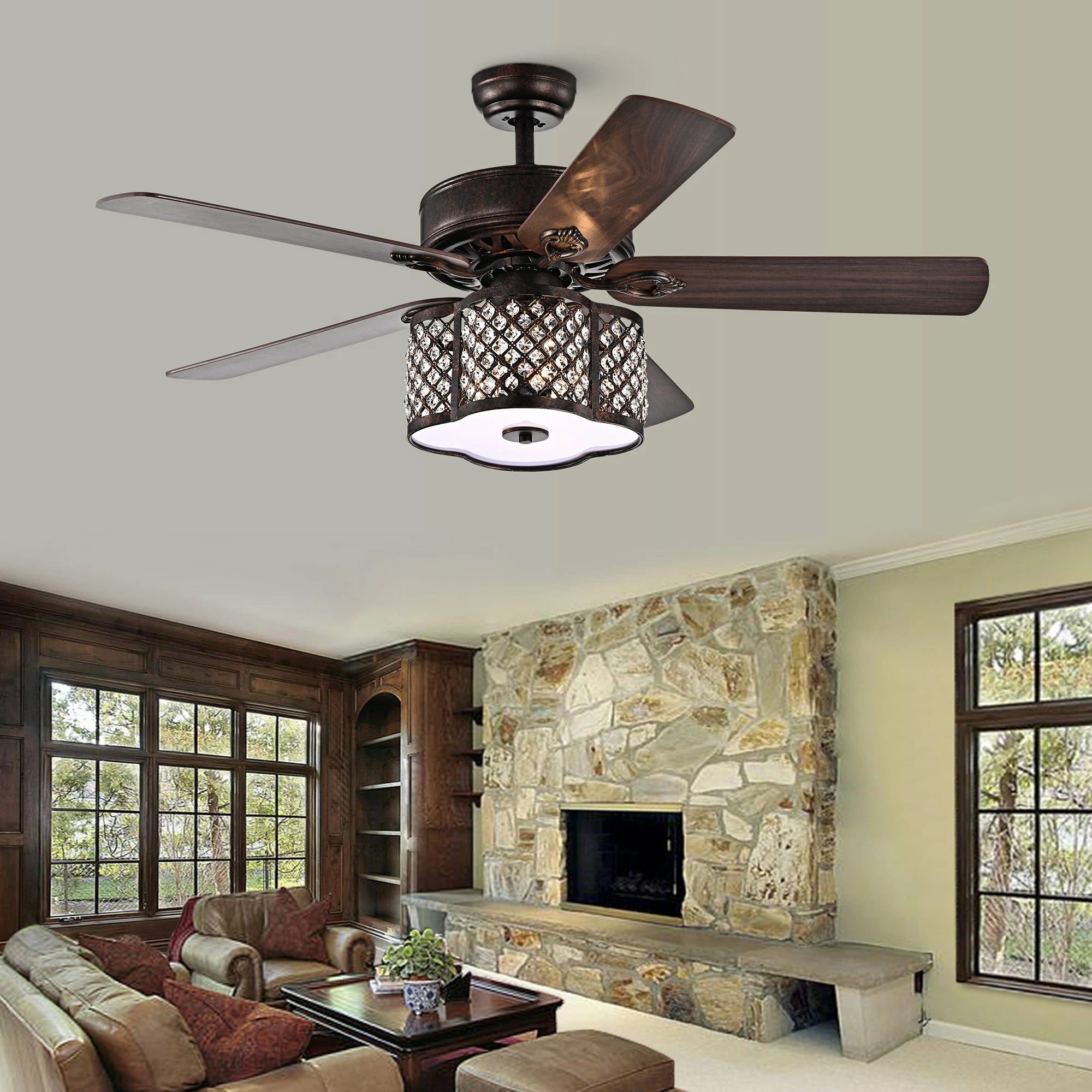 This timelessly appealing fandelier featuring a rustic bronze and crystal floral shade is a stunning choice. The five reversible wooden blades provide ample air flow and flexibility in decorating. The remote-controlled functionality offers additional convenience.