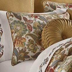 Showing off a gorgeously printed, multicolored floral Jacobean design, this fabulously cozy and robust four-piece comforter set boasts sun-kissed crimsons and teals, vivid pops of color elegantly grounded by a cream background. The oversized comforter is embellished with quarter-inch, woven, solid goldtone piping for rounding out the look in grand style.