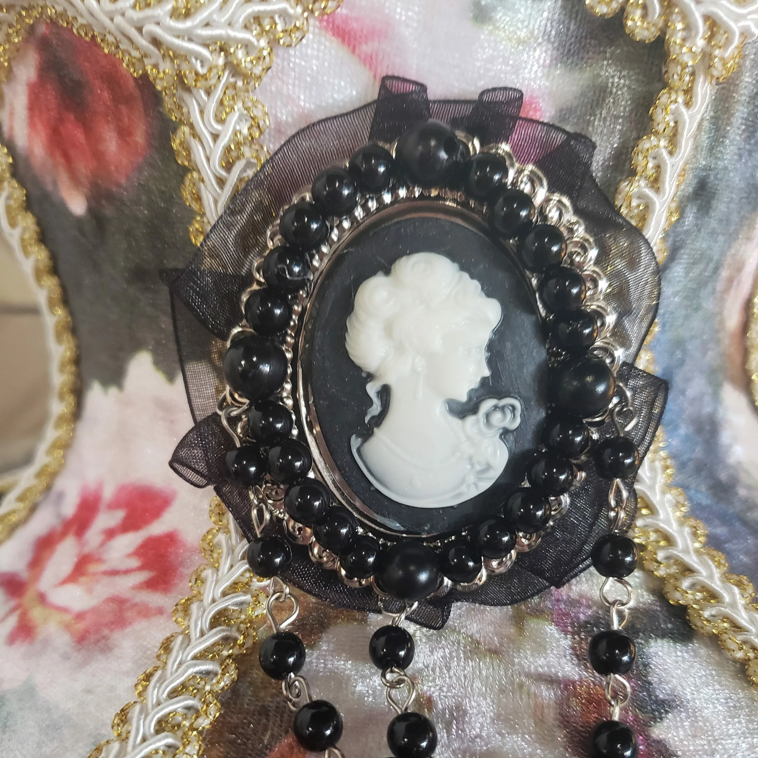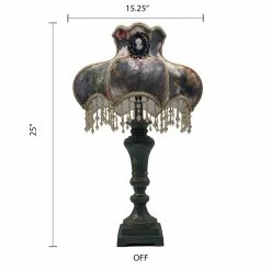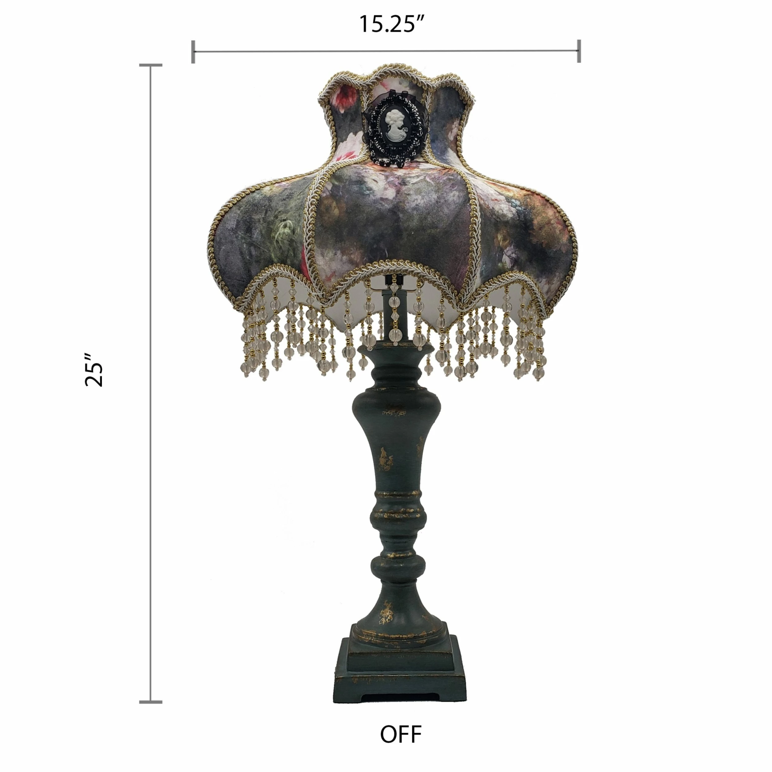 Showcasing a truly unique Victorian crown-shaped shade and designed with a rich velvet floral fabric, this table lamp is truly a masterpiece. Accented with cream and goldtone piping, a black and white cameo medallion, and more than 45 strands of clear and goldtone hanging jewels, the base of the lamp is antiqued in gold and sage green.