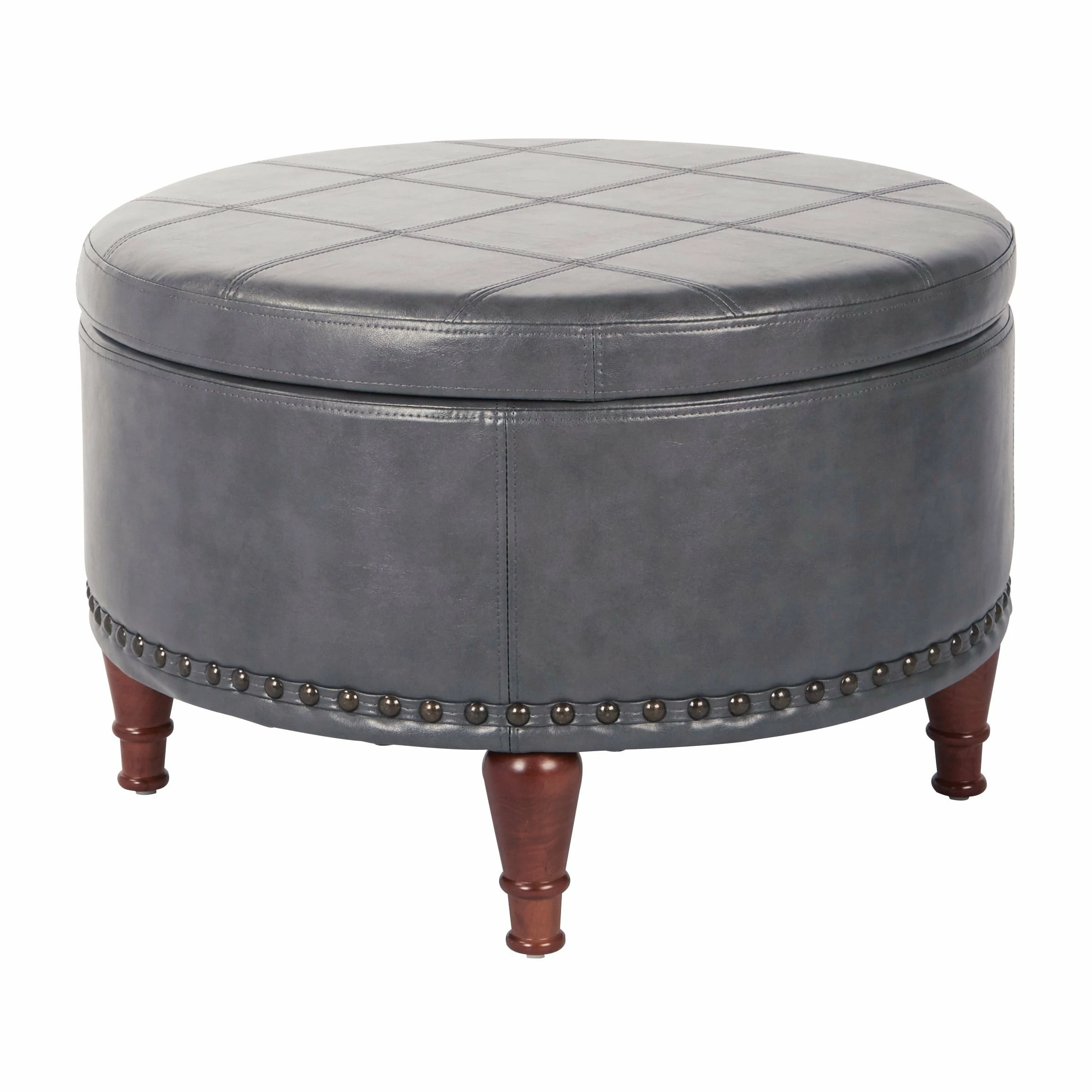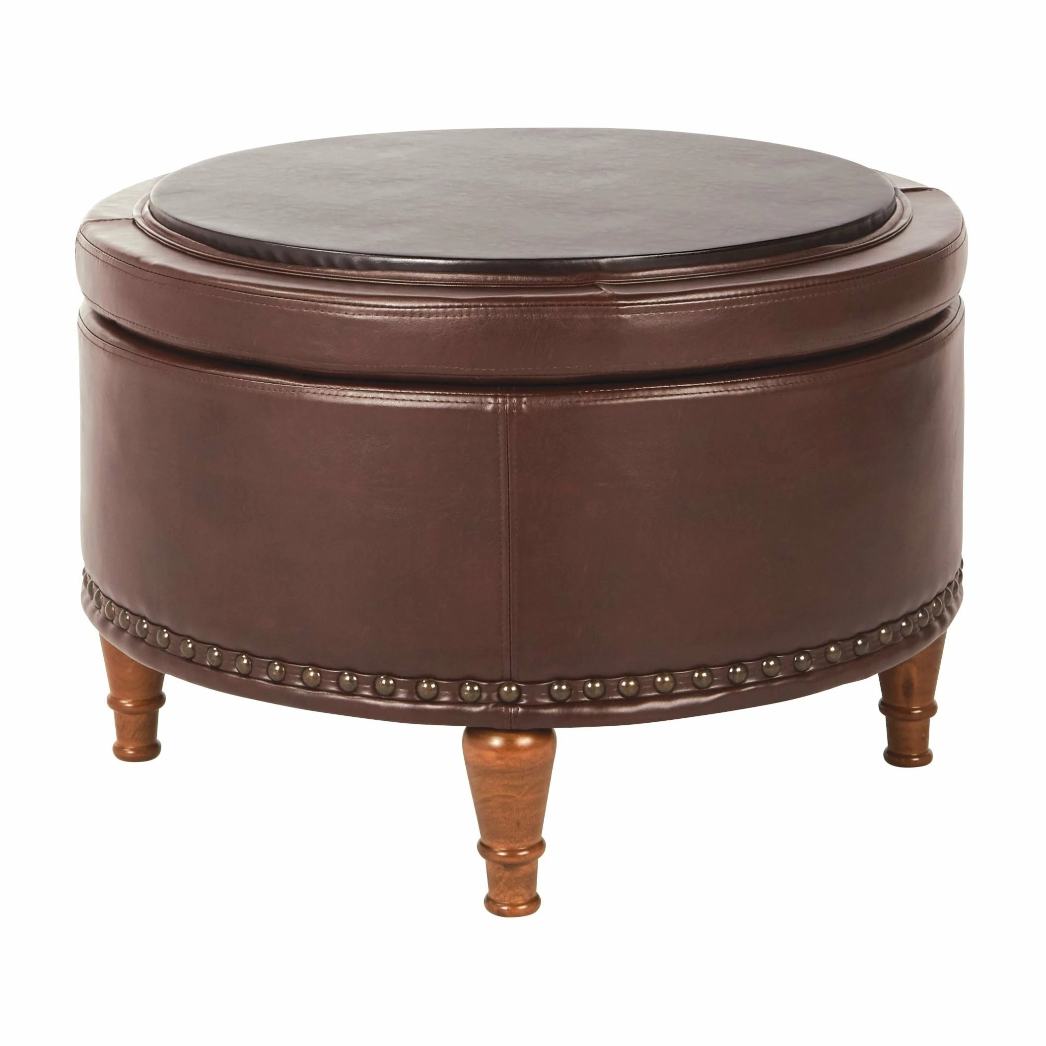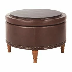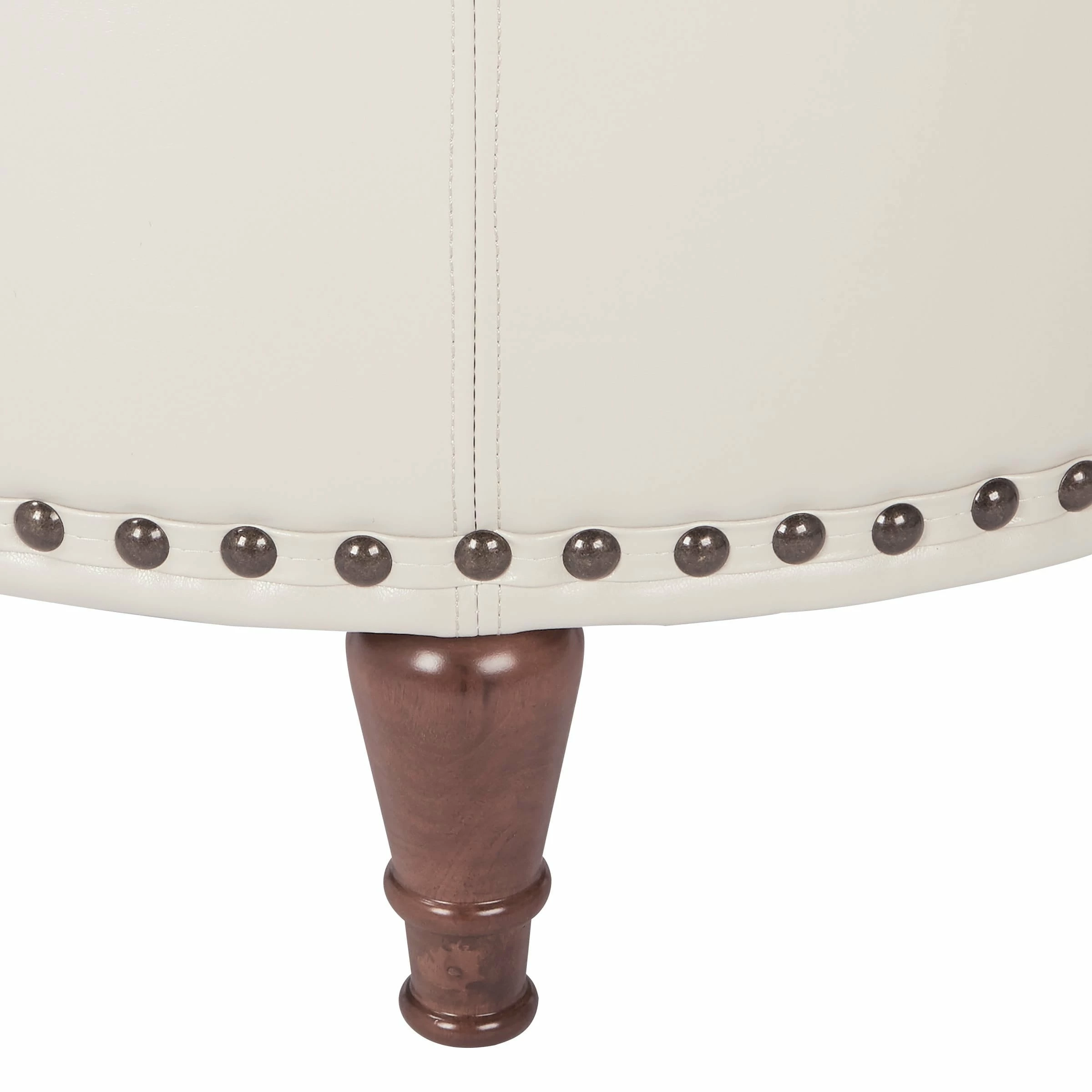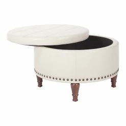 This gorgeous and tough storage ottoman garnishes petite functionality for your home. Capable of storing a variety of personal belongings for the sake of convenience, it adorns your space with chic style, including beautiful nailhead accents and sturdy wood legs, which are finished in a ravishing walnut brown and turned, for a robust and stylish piece.