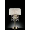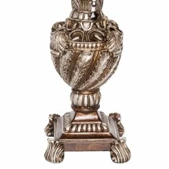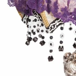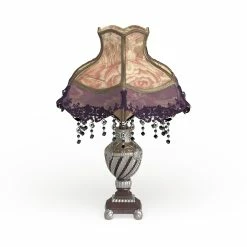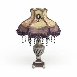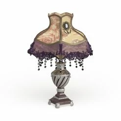 This laced jewel table lamp features a scalloped, trimmed, laced and beaded fabric shade that adds romantic, Victorian style to your decor. The shade is adorned with a beautiful black and white cameo brooch. The bronze-tone base has an ornate, detailed design completing the look.