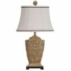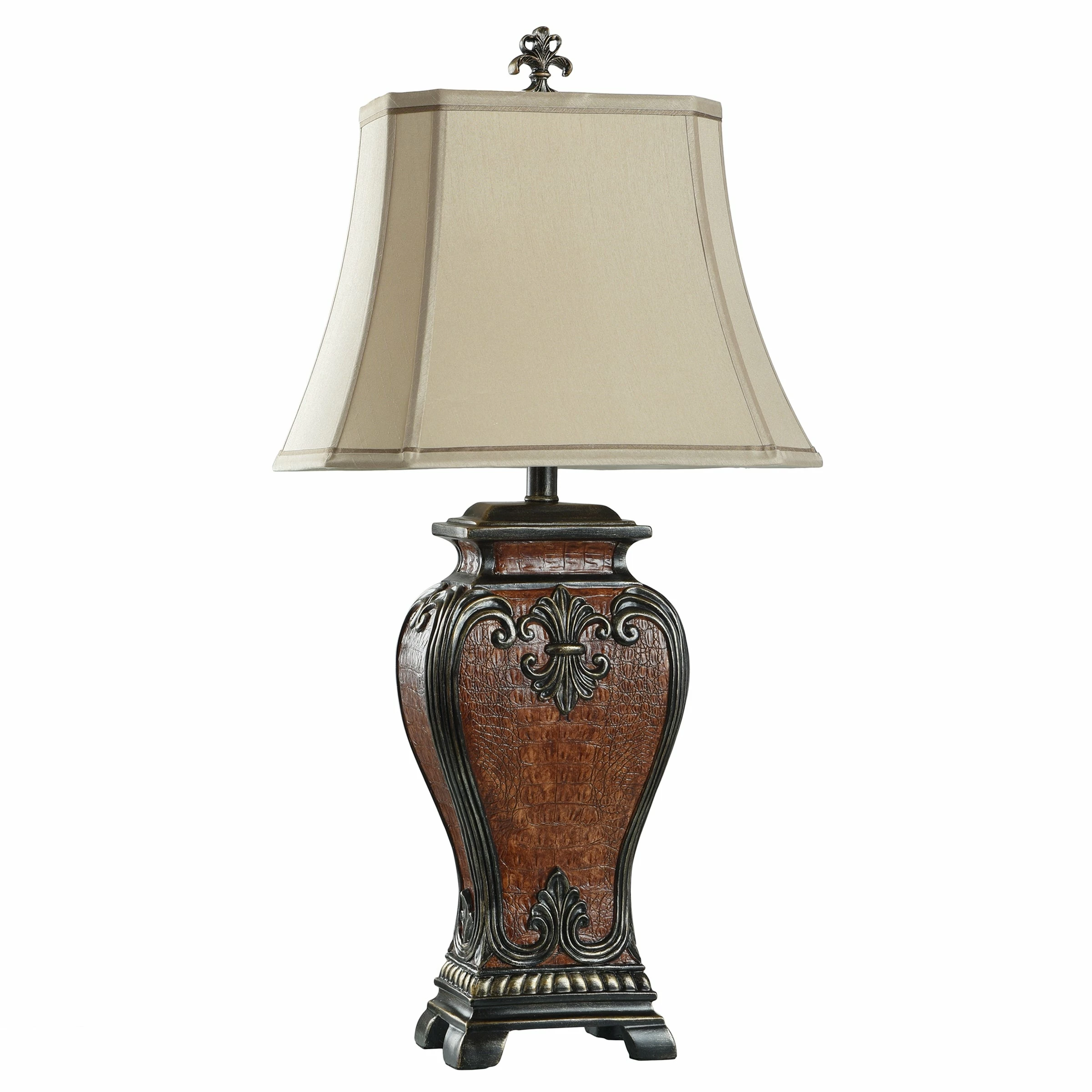 Complement your traditional decor with this ornate table lamp. The curved brown base is constructed from resin and accented with gold accents for contrast. A cut-corner fabric shade tops the piece and features a light beige hue.
