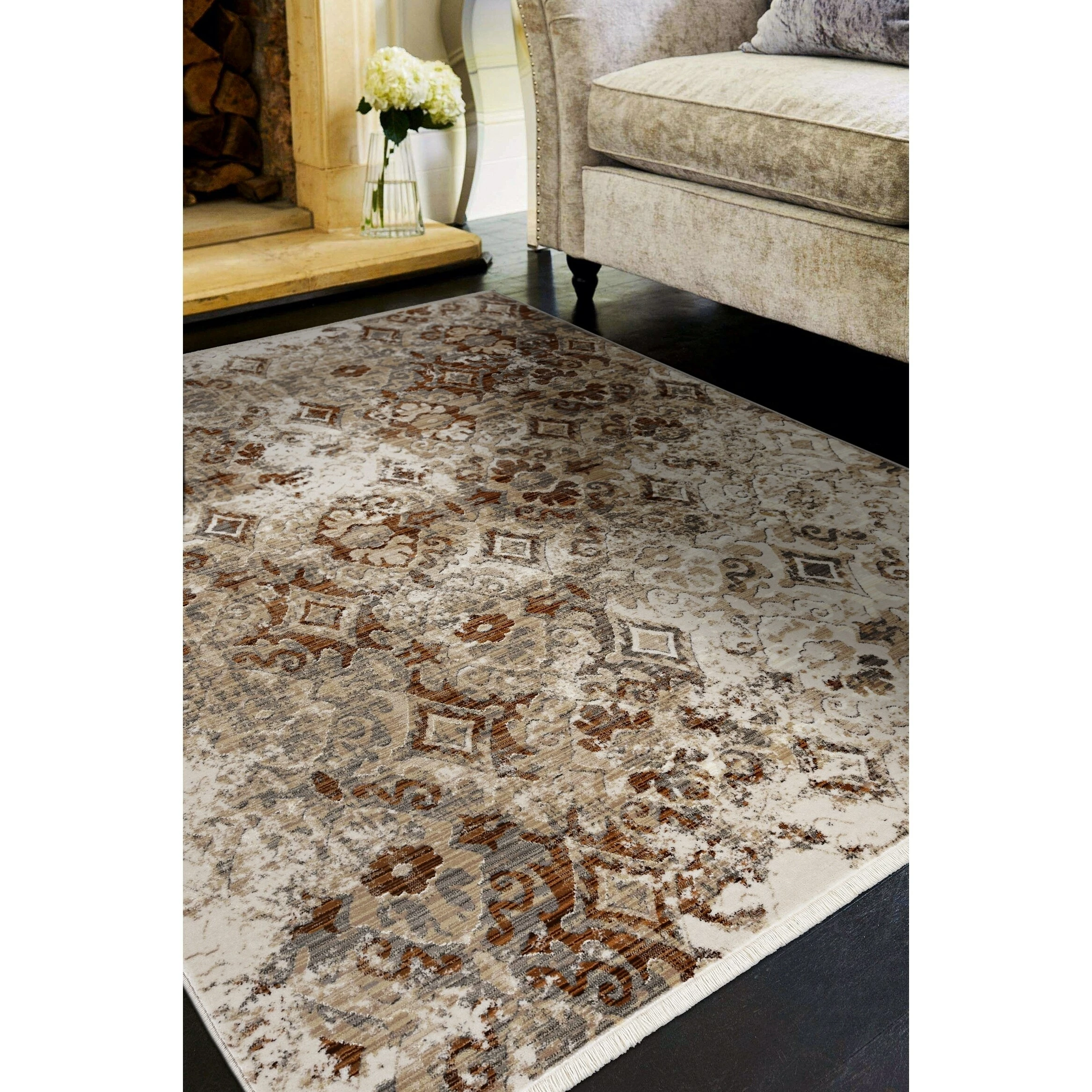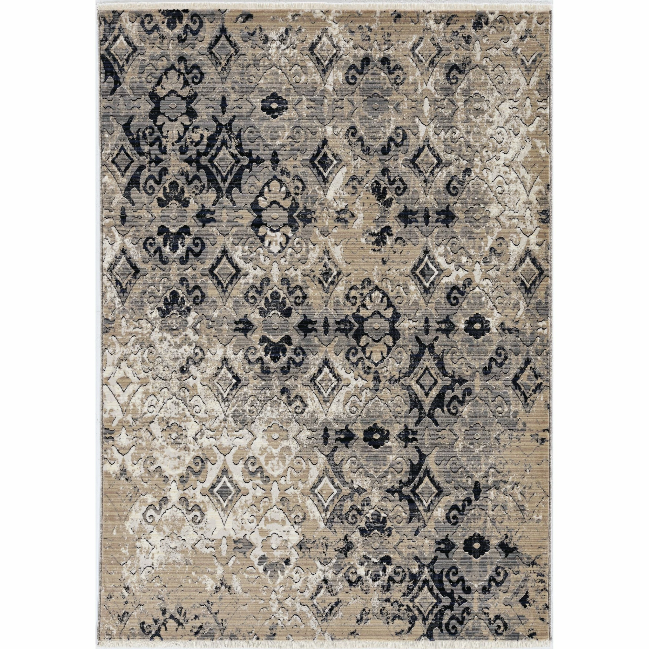 This vintage style rug has a distressed traditional design with fringed ends that add an elegant touch to any room. The Renza collection is crosswoven with polypropelene making it stain resistant and pet friendly while maintaining a high sheen pile with a hi-low texture. The use of a rug pad is recommended as there is no backing. Vacuum regularly & spot clean stains as needed.