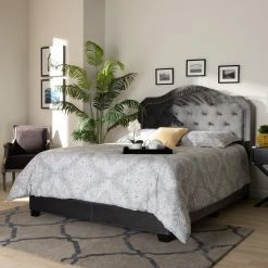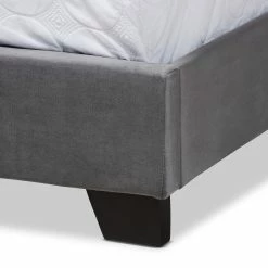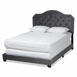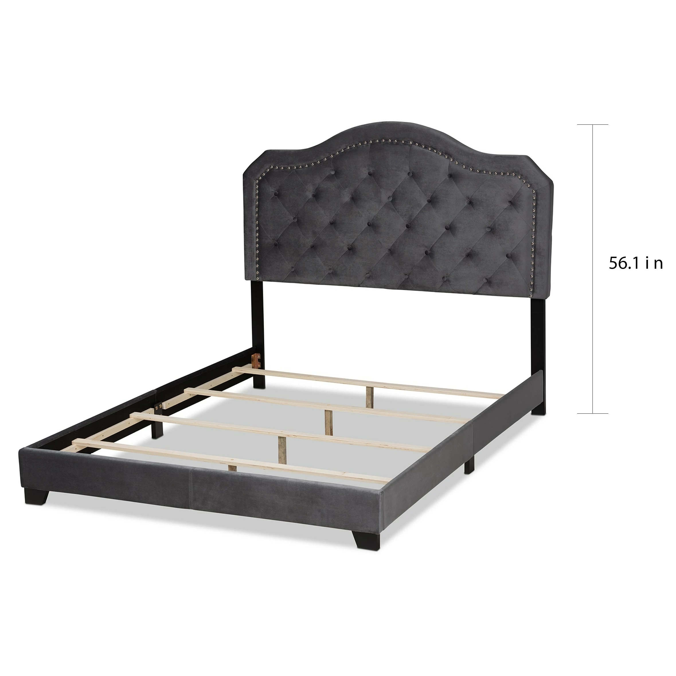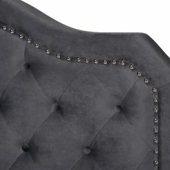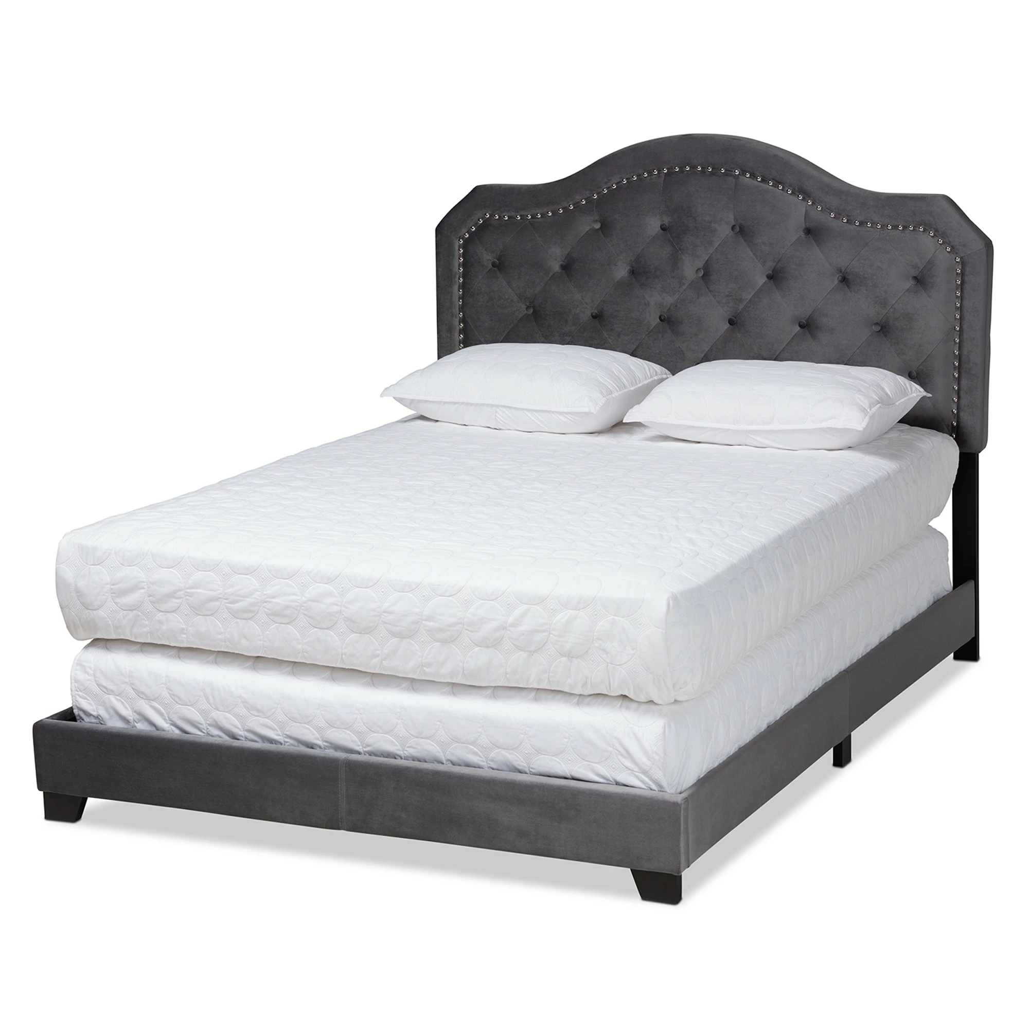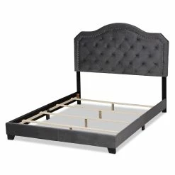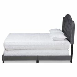 Grace your bedroom with the elegant button-tufted design of this modern-style Samantha bed. This bed is upholstered with soft velvet polyester fabric filled with foam for cushioning and comfort as well as easy care. This bed includes a matching upholstered frame and wooden slats for convenience.