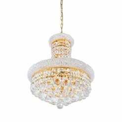 Dimensions: H 20 inches x W 18 inches x D 18 inches – Gold Finish – Requires 8 E12 Bulbs Max 60 W (sold separately) – Includes 72 inches of chain